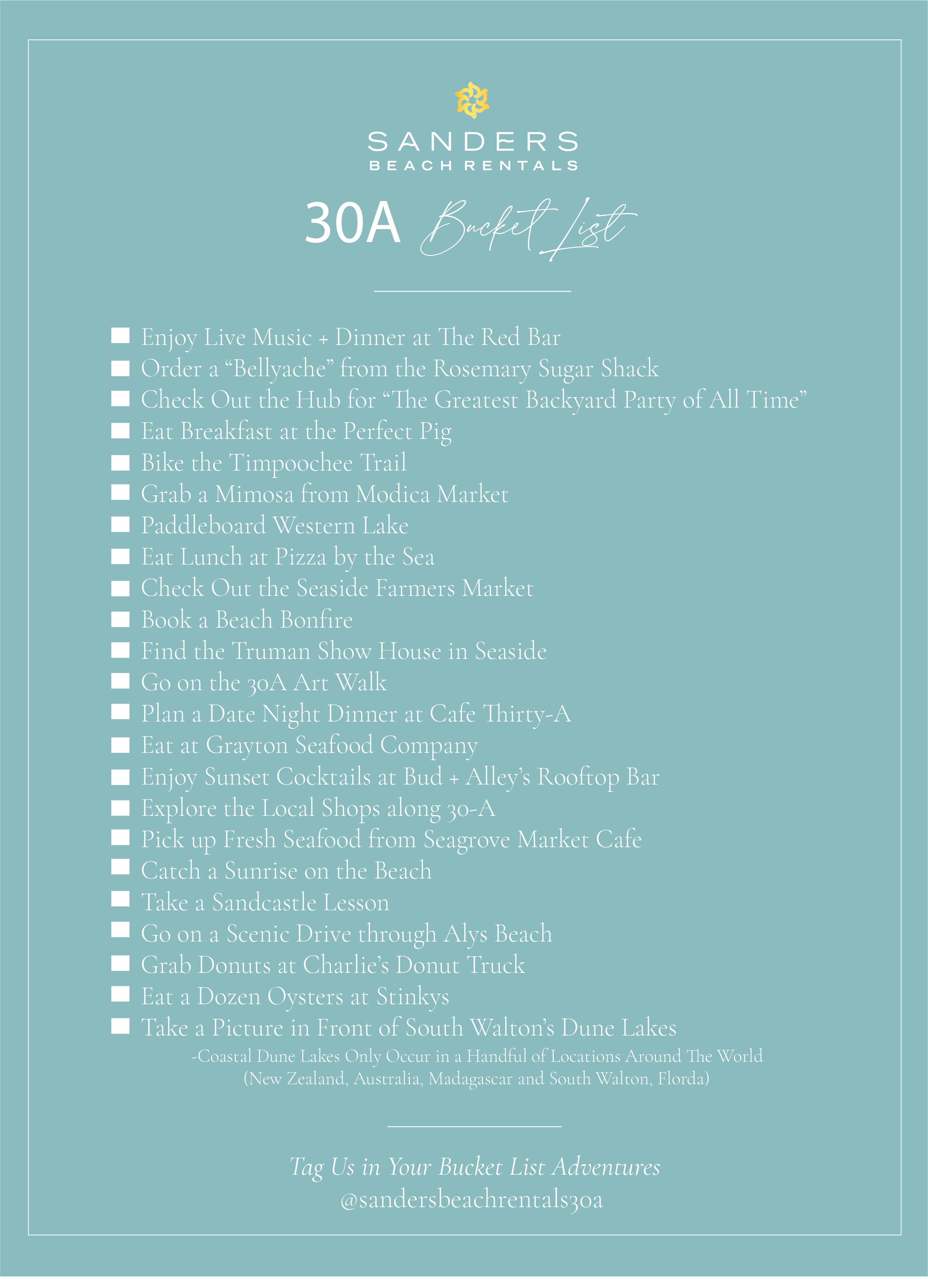 We’ve compiled the ultimate 30A bucket list for you to ensure your time here in sunny South Walton is nothing short of spectacular! There is truly something for everyone to enjoy. Plan your stay in one of our luxury 30A vacation rentals and start checking off those boxes on your next stay!